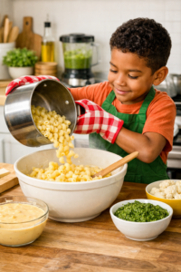 A key skill in this recipe is transferring ingredients. From pouring pasta into the pot to adding ingredients into the blender and mixing everything together at the end, children get to actively move food from one place to another. This hands-on step helps them see how ingredients change throughout the cooking process—like pasta softening or sauce becoming creamy—which builds both confidence and excitement to try the final dish.