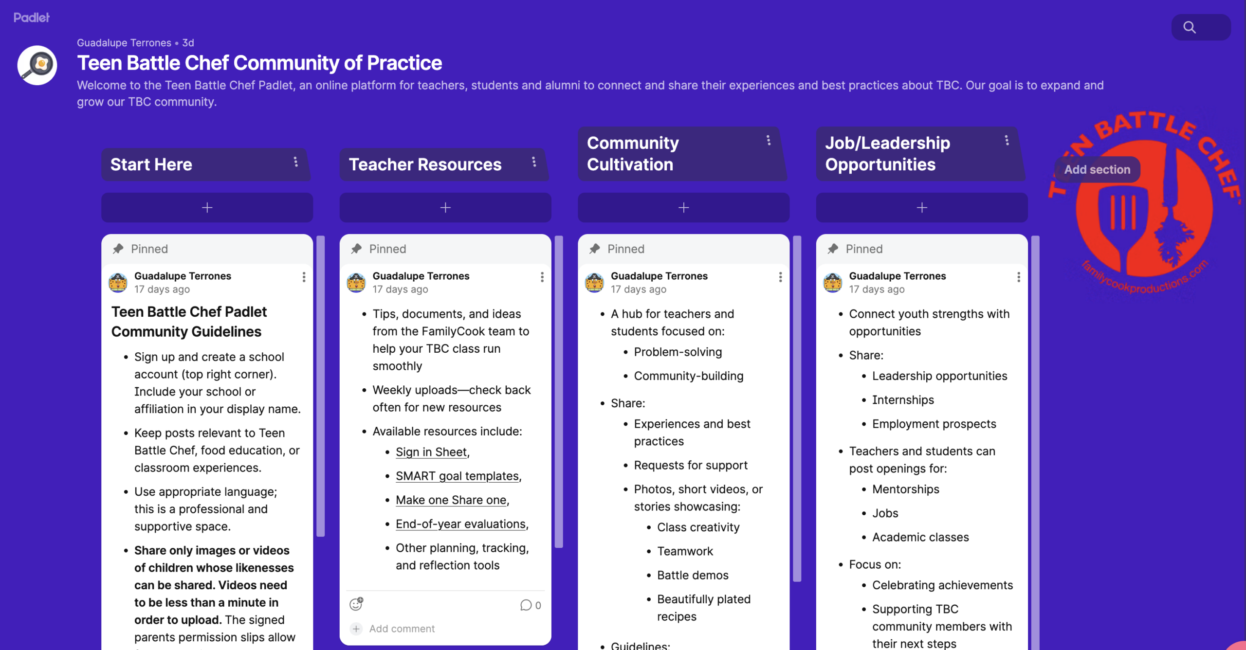 - Share Community Guidelines and Expectations: You can keep these short and concise and even borrow guidelines from other communities and modify them to suit yours. This will yield a more focused dialogue among participants that new visitors and participants will find helpful and relevant. Use the forum functions (ability to upload images and video etc., create separate info streams for different topics) to organize information you want to share. For example, one column could be from you, the program leader to share curriculum tips, videos and best practices. This column can then be distinct and separate from the community forum column where you want to encourage your TK teachers or instructors to share innovations and support one anothers’ challenges.